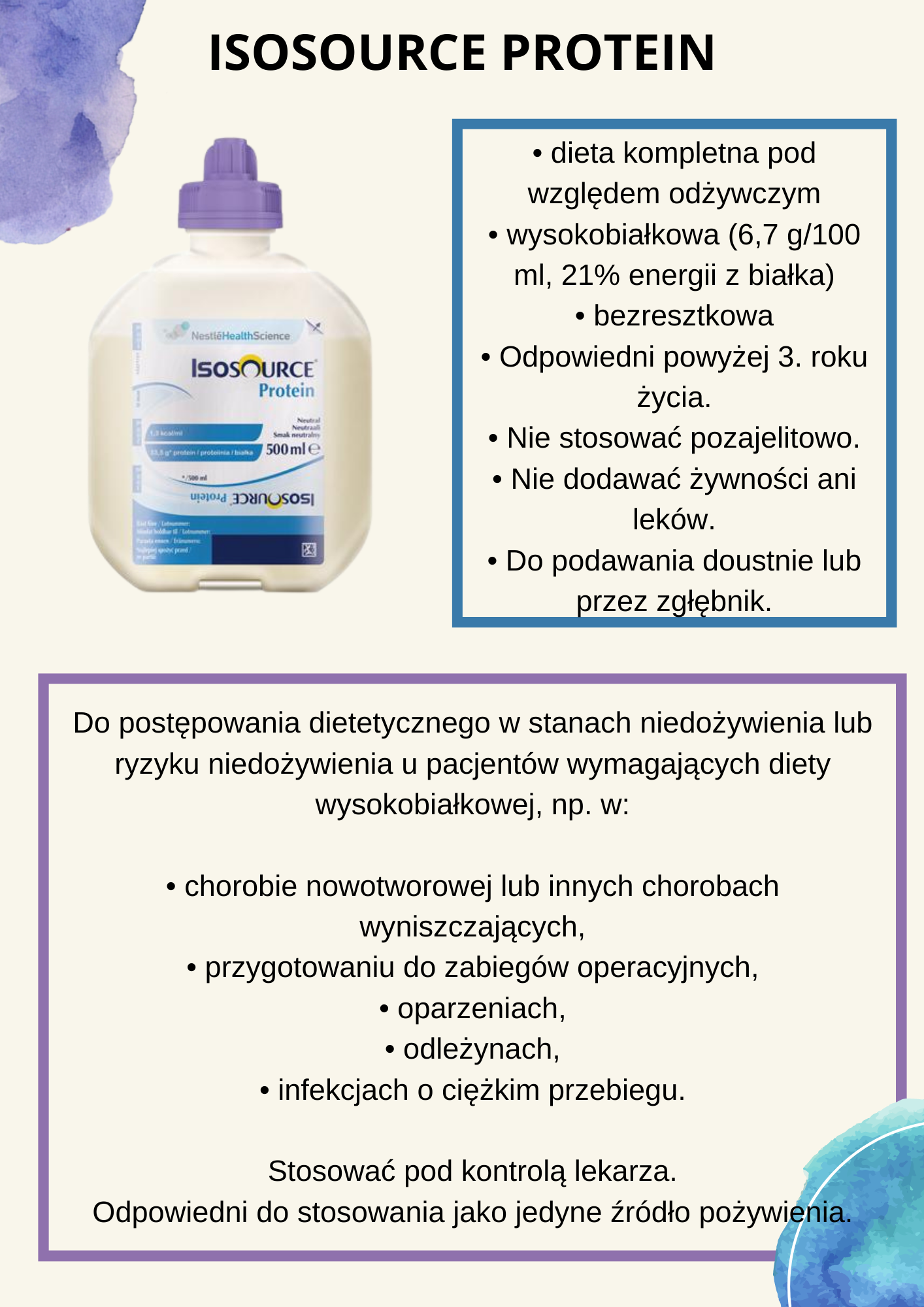 Isosource Protein to żywność specjalnego przeznaczenia medycznego do postępowania dietetycznego w stanach niedożywienia oraz z ryzykiem niedożywienia u pacjentów wymagających diety wysokobiałkowej. Produkt przeznaczony do podawania doustnego lub przez zgłębnik.