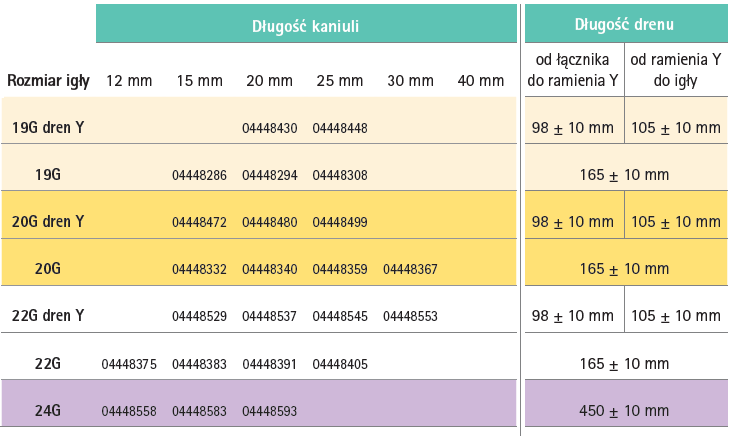 - igła ze skrzydełkami dostępna jest w wersji z drenem w kształcie litery Y i bez łącznika Y, wtedy możliwe jest (podczas badania CT) podawanie środka kontrastującego pod wysokim ciśnieniem