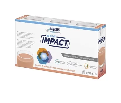 Impact Oral jest to to produkt spożywczy specjalnego przeznaczenia medycznego, który znajduje zastosowanie w postępowaniu dietetycznym u pacjentów w okresie okołooperacyjnym oraz w przypadkach takich jak odleżyny, trudno gojące się rany, stres metaboliczny. Produkt zawiera wiele wartości odżywczych, jest wysokobiałkowy oraz wysokoenergetyczny.