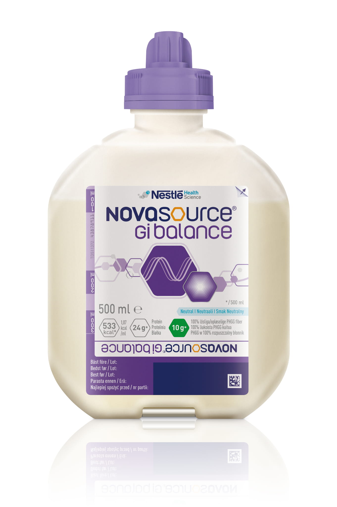 Novasource Gi Balance to żywność do stosowania u pacjentów ze zmniejszoną tolerancją glukozy np. w cukrzycy lub w stanie niedożywienia oraz u pacjentów z zaburzeniami żołądkowo-jelitowymi. Żywienie specjalnego przeznaczenia medycznego z dodatkiem rozpuszczalnego błonnika PHGG, ze specjalnym profilem węglowodanów. Do podawania przez zgłębnik lub doustnego.