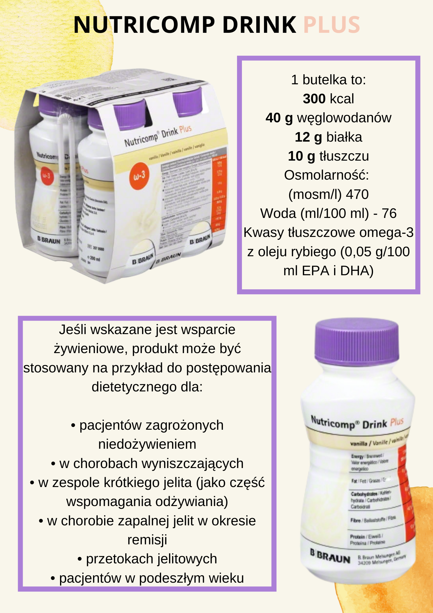 Nutricomp ® Drink Plus to napój specjalnego przeznaczenia medycznego, pełnowartościowy, wysokoenergetyczny (1,5 kcal/ml), bezbłonnikowy, bezglutenowy, ubogi w laktozę. Do postępowania dietetycznego w przypadku niedożywienia związanego z chorobą, dla pacjentów o zwiększonym zapotrzebowaniu na energię.