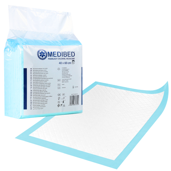 Podkłady chłonne jednorazowe 40x60 cm, niejałowe. Chłonność 410 ml. Opakowanie zawiera 25 sztuki.