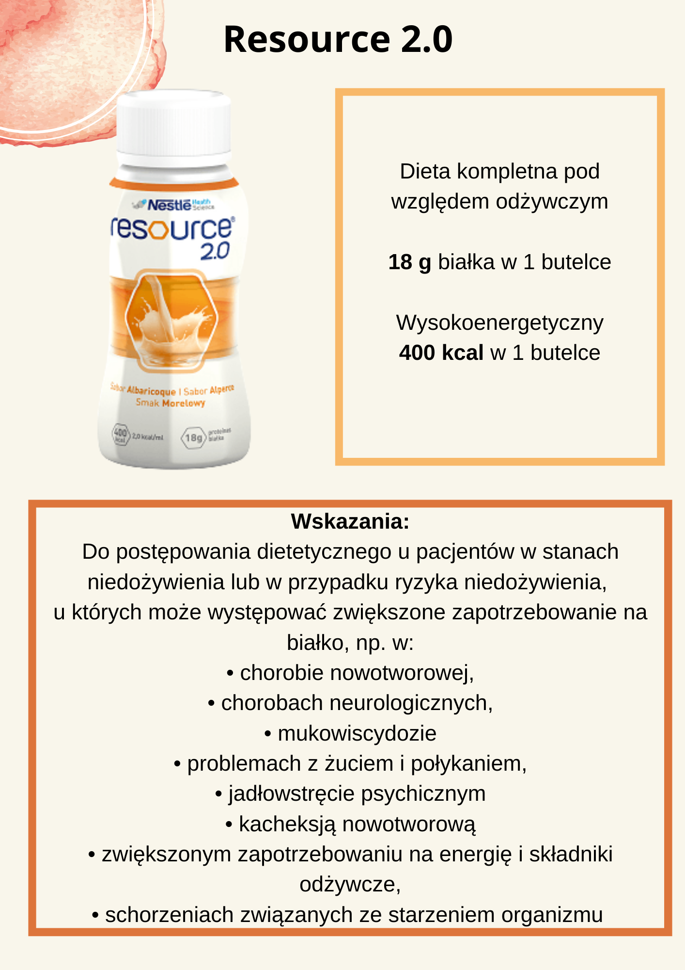 Resource 2.0 to wysokoenergetyczny, zawierający witaminy i składniki mineralne preparat odżywczy bez błonnika, gotowy do picia. Przeznaczony do wsparcia żywieniowego pacjentów niedożywionych lub/i z ryzykiem niedożywienia.