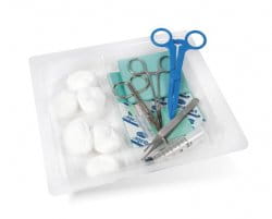 - 1 x serweta włókninowa 50 cm x 50 cm (barierowa) z przylepnym otworem 5 cm x 10 cm